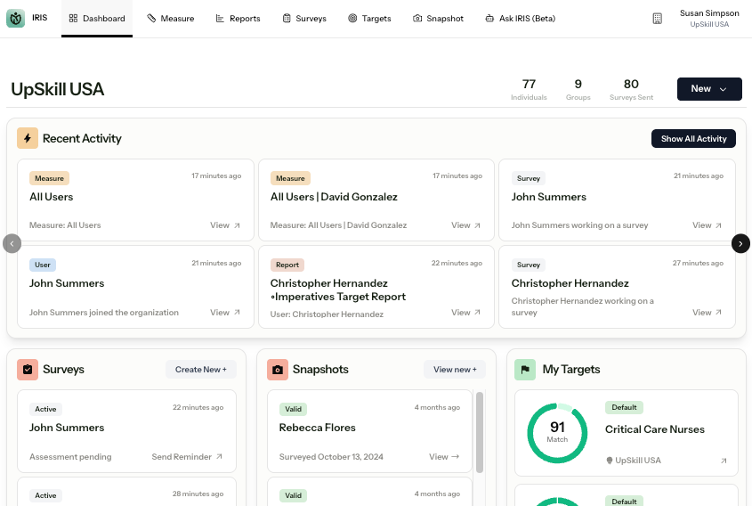 The Dashboard is your command center. It shows what’s happening right now—survey activity, recent results, and organizational progress—so you can take action quickly.