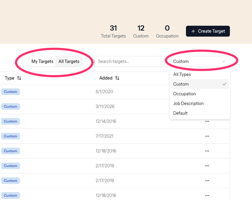 - My Targets tab was added to the Targets page along with a filter for types of Targets to better organize the page and make it easier to search. Any targets you create from this day forward will be added to the My Targets tab.
